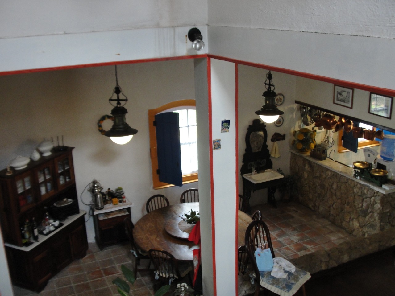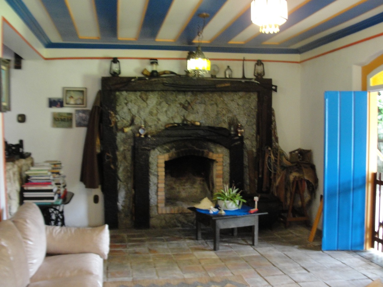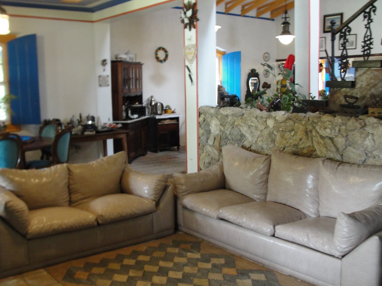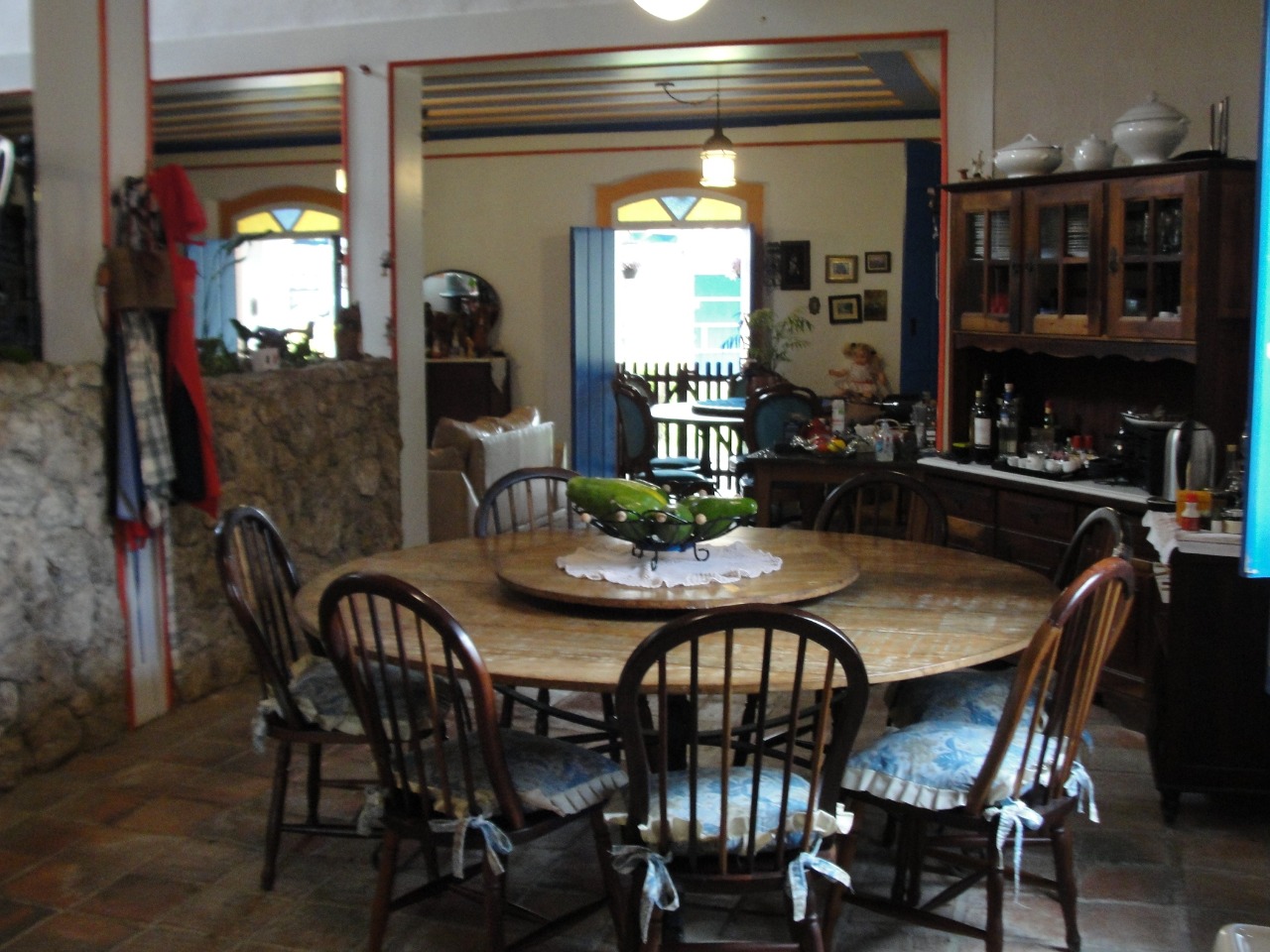 Pav. Térreo: Sala de estar com lareira, ampla sala de jantar, cozinha, despensa, adega no porão.